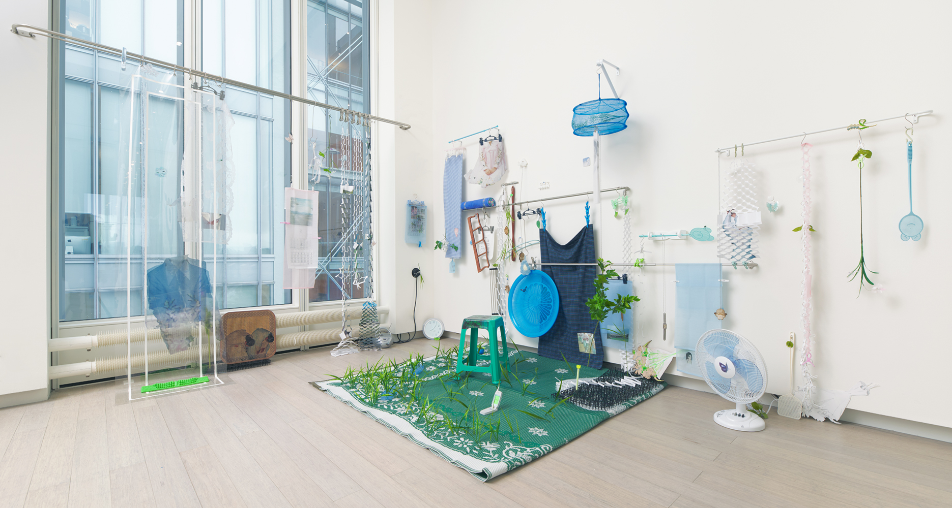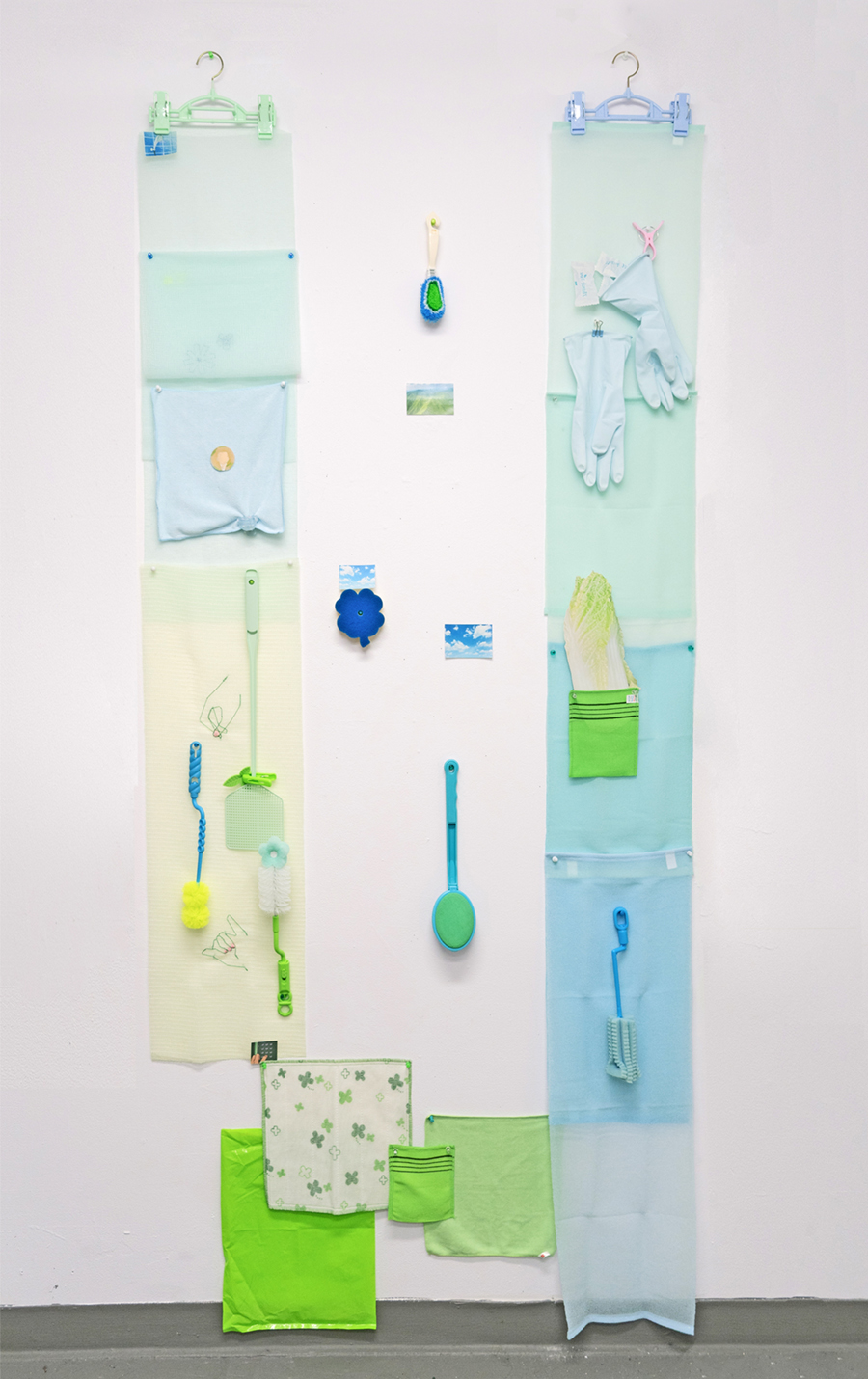 She left nothing but the scent of flowers... / 2024 / Acrylic on wood panel and floor mat, drying rack, towels, washcloth, sponges, clips, massagers, artificial foliage, key chains, rubber leaves, fan, surge protector, inkjet prints on vellum, and air freshener / 67 in. H x 58 in. W x 80 in. D