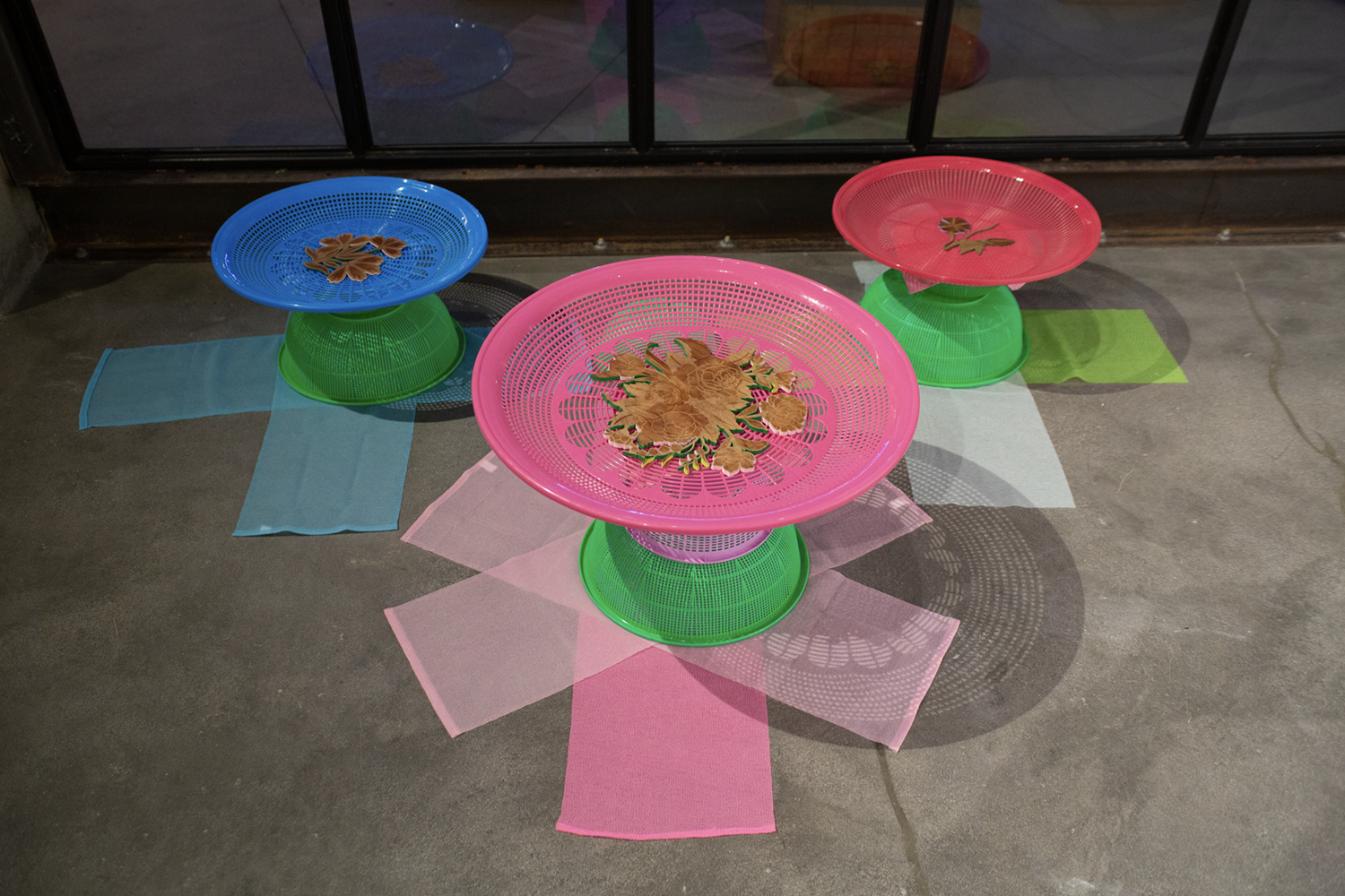 A table that blooms for us / 2024 / Wood panel, colanders, baskets, kitchen towels, and bath towels / Dimensions variable