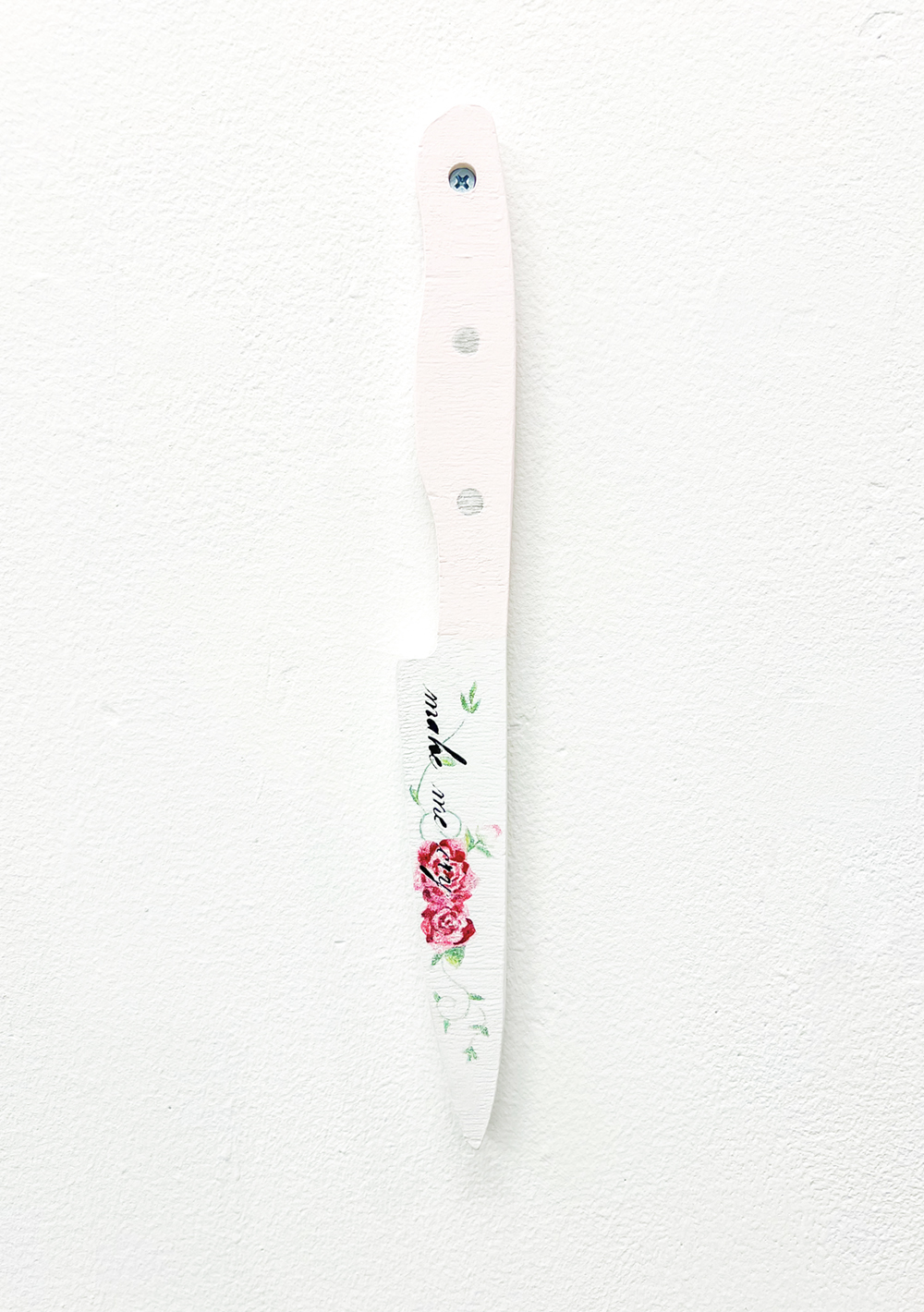 Rosy knife / 2024 / Acrylic and colored pencil on wood panel, metal binder ring, flower hand massager / 3.5 W x 34 H x 3 D in.