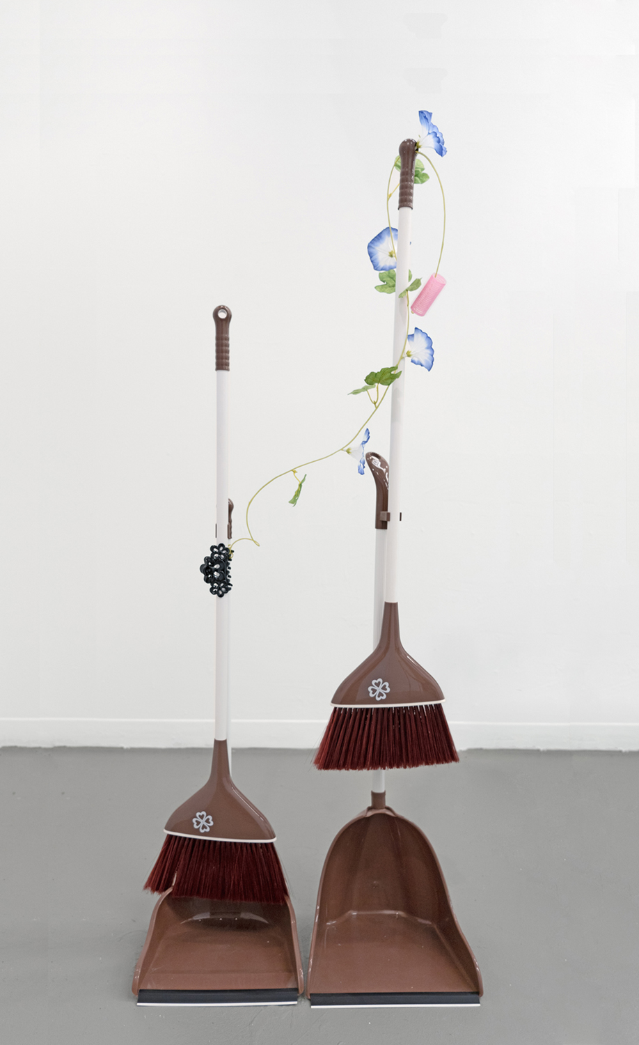 dyed red hair with flowers / 2024 / Brooms, hair clip, curler, morning glory / Dimensions variable